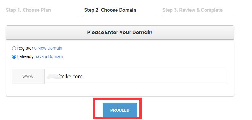 若你尚未注册网站域名,建议提前在 Namecheap、阿里云等正规域名平台完成注册。在对应操作界面中,选择【I already have a Domain】(我已拥有域名)选项,输入已注册的网站域名,随后点击【Proceed】(继续)。