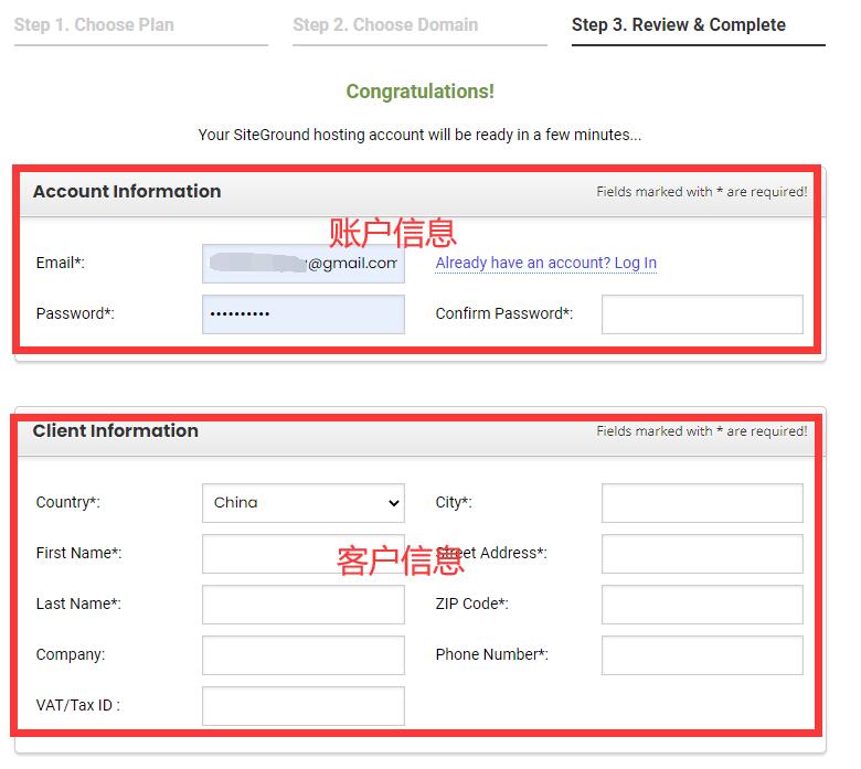 - 账户信息(Account Information):填写用于登录 SiteGround 主机的邮箱和密码,务必妥善保存账号密码,避免丢失;
