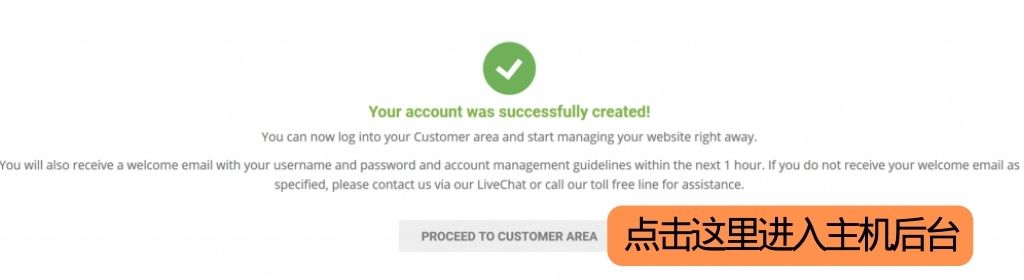 付款成功后,点击【Proceed to Customer Area】(前往客户中心)进入主机账户。