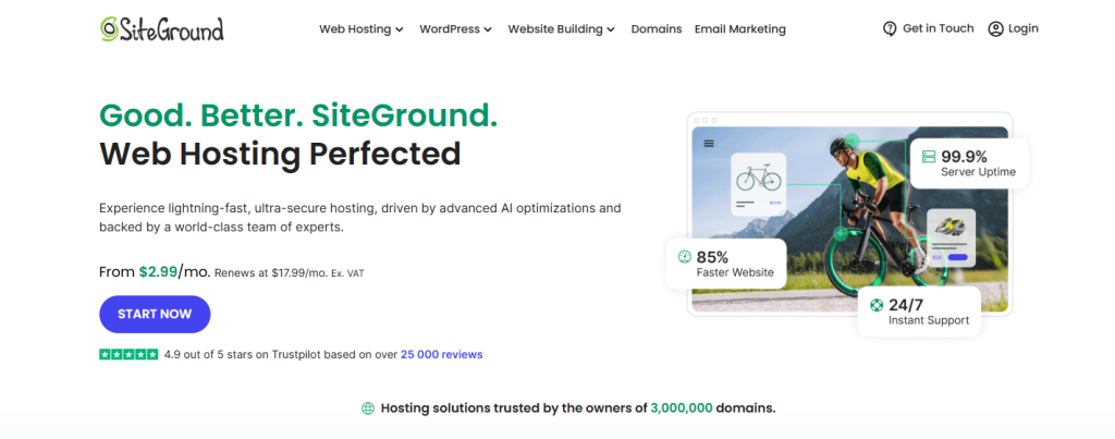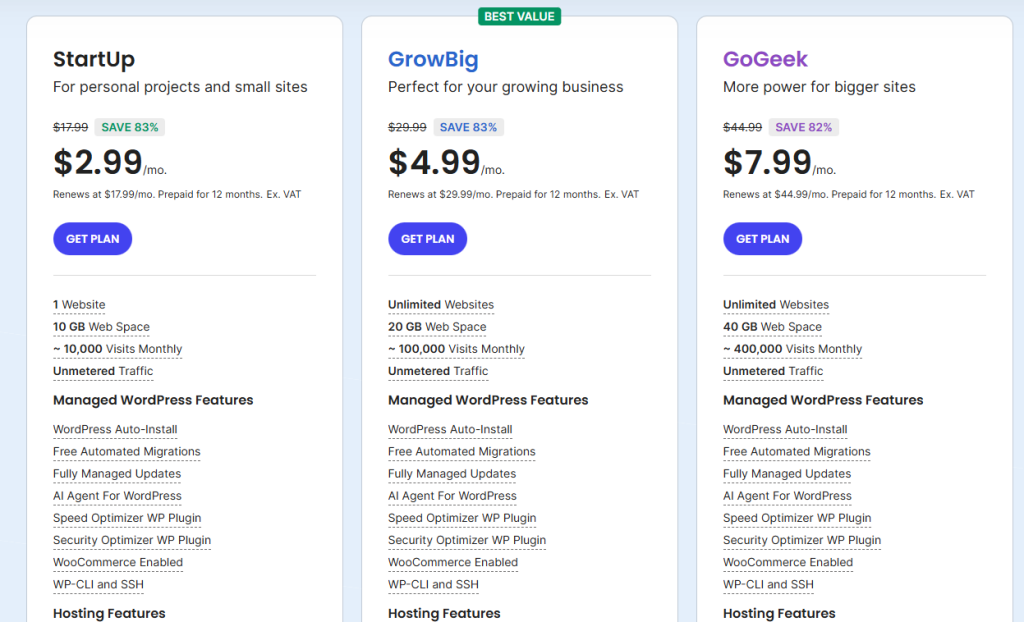- 新手入门首选 Startup 套餐(每月 $2.99):支持 1 个网站,配备 10GB 网页存储空间,每月可承载约 10,000 次访问,包含无限流量、免费域名、免费 WP 安装服务、免费 WP 迁移工具、免费邮件迁移工具、WordPress 自动更新、免费 SSL 证书、每日备份以及免费 CDN 等权益;